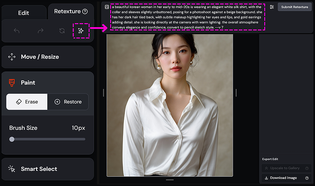 - 업로드한 인물 이미지에서 Retexture 버튼 클릭.