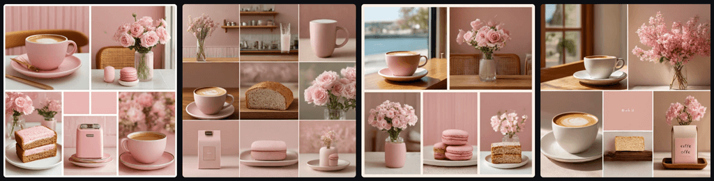 핑크톤 중심 브랜드 무드보드, 부드러운 빈티지 타이포그래피, 아늑한 카페 분위기, 따뜻한 파스텔 색조, 자연스러운 질감이 느껴지는 부드러운 소재감, 봄날의 우아함을 연상시키는 큐레이션 된 시각 요소들