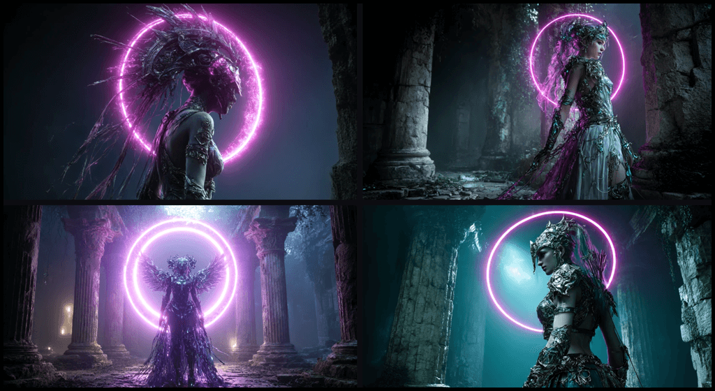 고대 그리스 여신, 사이버펑크 스타일, 신화적 판타지 분위기, 빛나는 네온 후광, 언리얼 엔진 렌더링