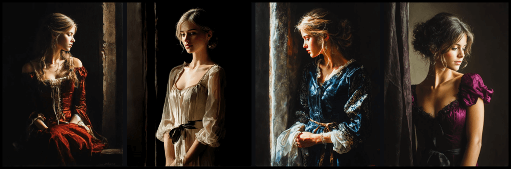 여성 초상화, 실크 드레스, 르네상스 스타일, 창문에서 들어오는 부드러운 빛, 사실적인 묘사