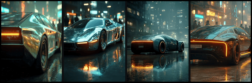 futuristic car design, chrome surface, cyberpunk city at night, octane render, dramatic lighting --v 7 --ar 3:4