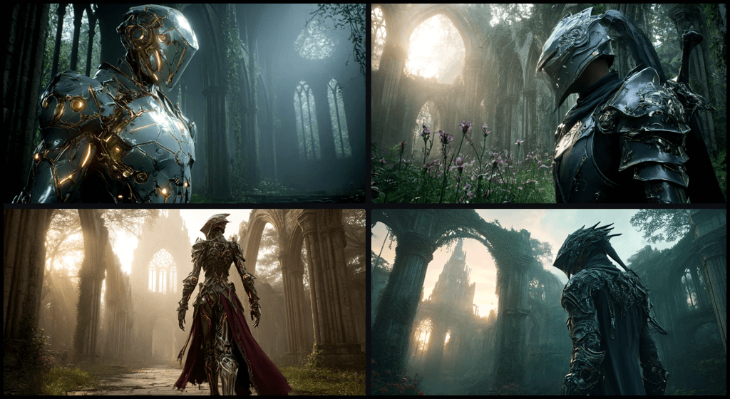 중세 기사, 하이테크 미래형 갑옷 스타일, 고딕 대성당 폐허 배경, 부드러운 시네마틱 조명, 언리얼 엔진 렌더링