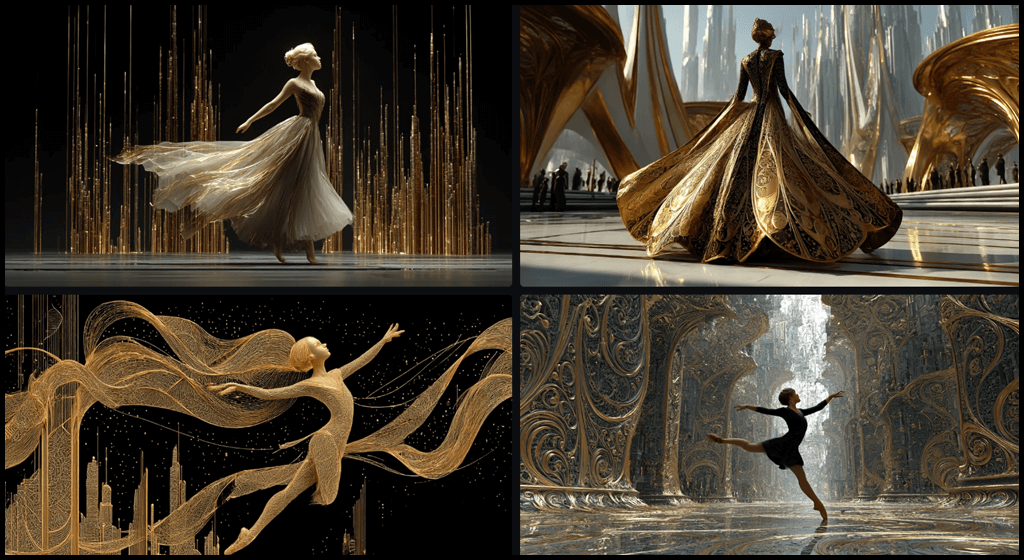 an elegant dancer, art nouveau style, dystopian futuristic city background, golden flowing patterns, octane render --v 7 --ar 16:9